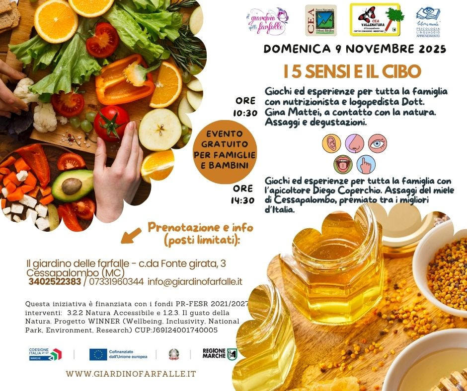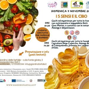 Ore 10:30 giochi ed esperienze per tutta la famiglia con la nutrizionista e logopedista Dott. Gina Mattei. I 5 sensi aiuteranno i partecipanti a scoprire il cibo e la natura. Assaggi e degustazioni. Il pomeriggio ore 14:30 giochi ed esperienze per tutta la famiglia con l'apicoltore Diego Coperchio. Assaggi del miele di Cessapalombo pluripremiato fra i migliori d'Italia. Allertate i vostri sensi e prenotate l'esperienze anche whatsApp 3402522383. Possibilità di prenotare il pranzo nei locali del giardino con menu alla carta. Possibilita' di prenotare anche solo uno delle due attività previste. Evento gratuito adatto a famiglie e bambini.